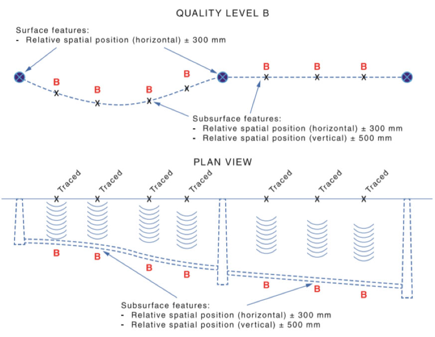 Quality B – Provides relative subsurface feature in three dimensions by tracing or physical measurement that does not satisfy the spatial tolerance of Quality Level A.