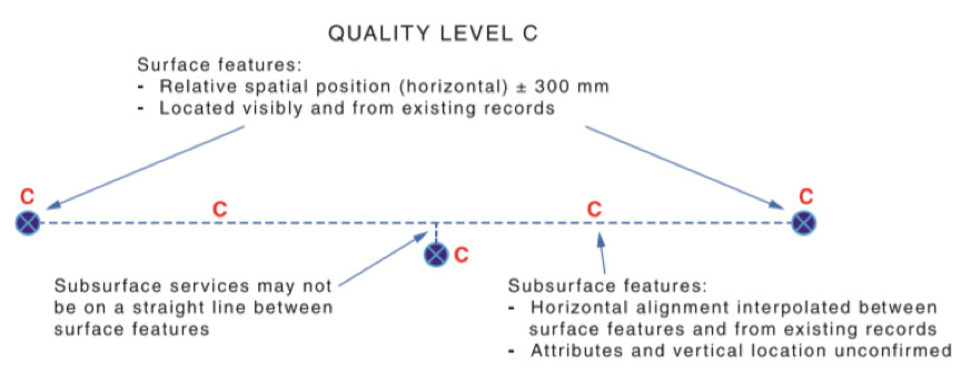 Quality C – Is described as a surface feature correlation or an interpretation of the approx. location and attributes of a subsurface utility using combination of existing records, visible evidence etc.