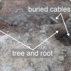 Australian Standard states power cables should be at 600mm deep although this is not always the case and can never be assumed as correct, we have seen power cable at 150mm deep where tree roots had lifted the conduits up over years.